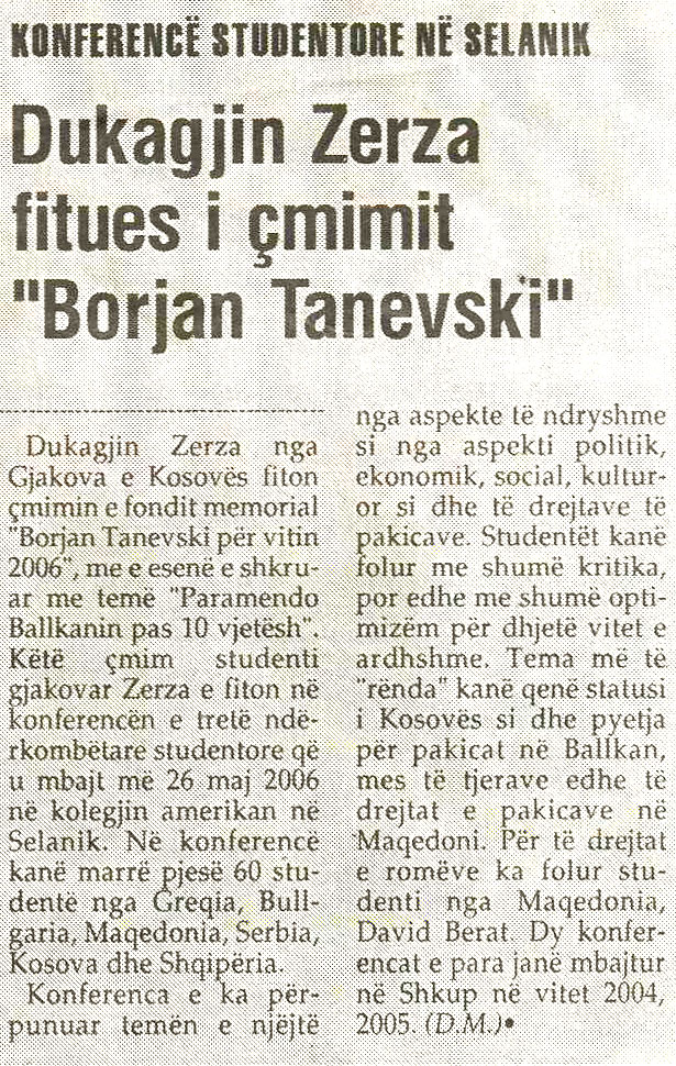 СОЛУН - „На Балканот му претстојат два правци: развој и прогрес или враќање во историјата и регрес. Првиот е вистинскиот пат, додека вториот пат е оној по кој се одеше изминативе години, а кој донесе падови, конфликти и војни. Меѓу овие две сценарија, сите комбинации се можни. Но, овој дел на светот ја има една од најоптимистичките млади популации. И јас припаѓам на таа група луѓе. Имам визија дека Балканот ги помина своите најлоши денови и дека му претстои посветла иднина“. Вака младиот Дукаџин Зерза од Косово, студент на Американскиот колеџ во Солун, ја предвиде иднината на Балканот за десет години. Тој со својот есеј на оваа тема ја освои овогодинешната награда на Меморијалниот фонд „Борјан Таневски“, кој во негова чест се доделува секоја година на Американскиот колеџ во Солун. Зерза е студент на трета година на отсекот за интернационални односи. Наградата која му беше доделена е годишна школарина во износ од 1.000 евра.